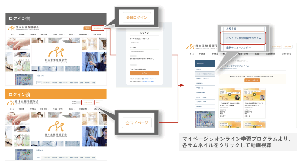 動画視聴は、マイページ > オンライン学習支援プログラム からお入りください。